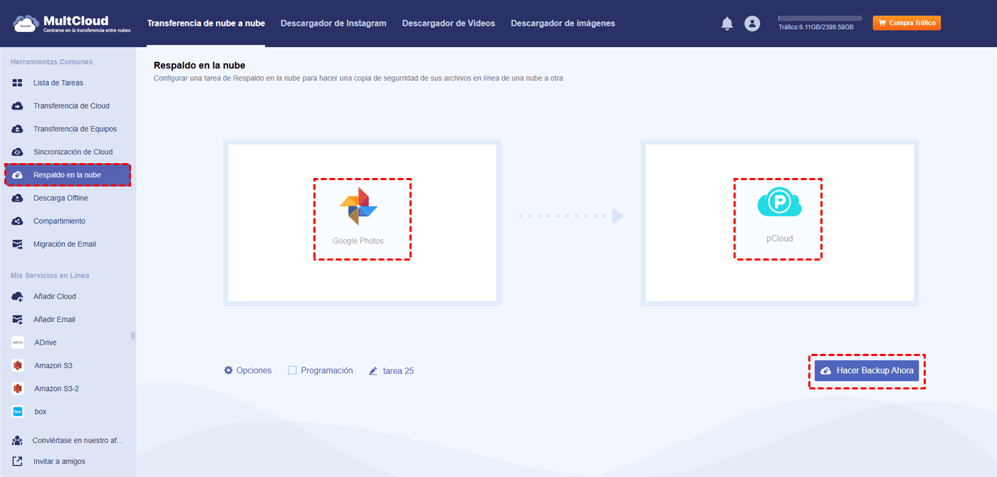 - Respaldar archivos entre diferentes nubes. Transfiere fotos y archivos fácilmente entre Google Drive, pCloud y otros servicios en la nube sin necesidad de descargarlos ni subirlos manualmente. Por ejemplo, puedes respaldar Google Fotos en Amazon Fotos.