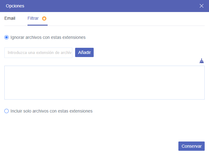 - En las "Opciones", puedes activar la Notificación por correo electrónico para que te notifiquen cuando la tarea de Copia de seguridad en la nube esté terminada. O, puedes configurar el Filtro para ignorar o solo hacer una copia de seguridad de datos con ciertas extensiones.