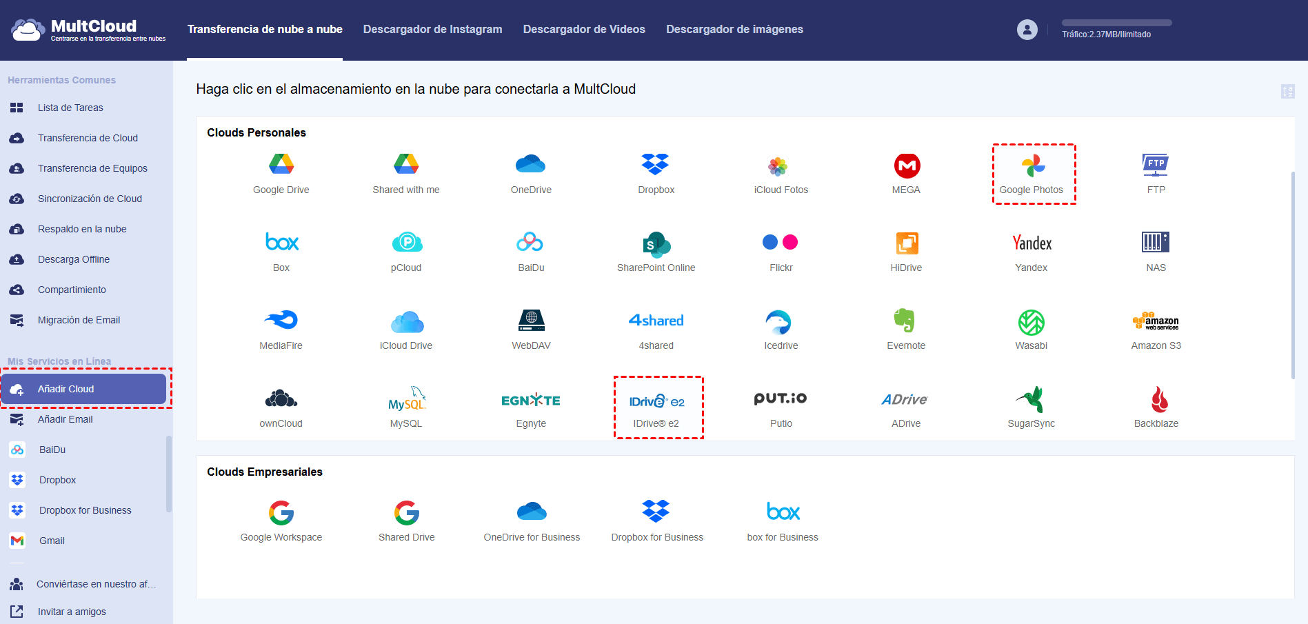 2. Añadir Google Photos y IDrive a MultCloud: Conecta tus cuentas de Google Fotos e IDrive a MultCloud utilizando el proceso de autorización proporcionado.