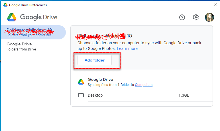 Paso 4. Selecciona "Mi Computadora" y luego elige "Agregar Carpeta". Después, selecciona la carpeta de fotos en la carpeta de Google Drive en la siguiente ventana.