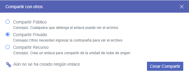 4. Marca Compartir Público, Compartir Privado o Compartir Recurso y pulsa Crear Compartir.