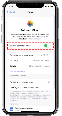 Paso 5. Toca iCloud > Fotos y activar "Sincronizar este iPhone" de la página Fotos en iCloud.