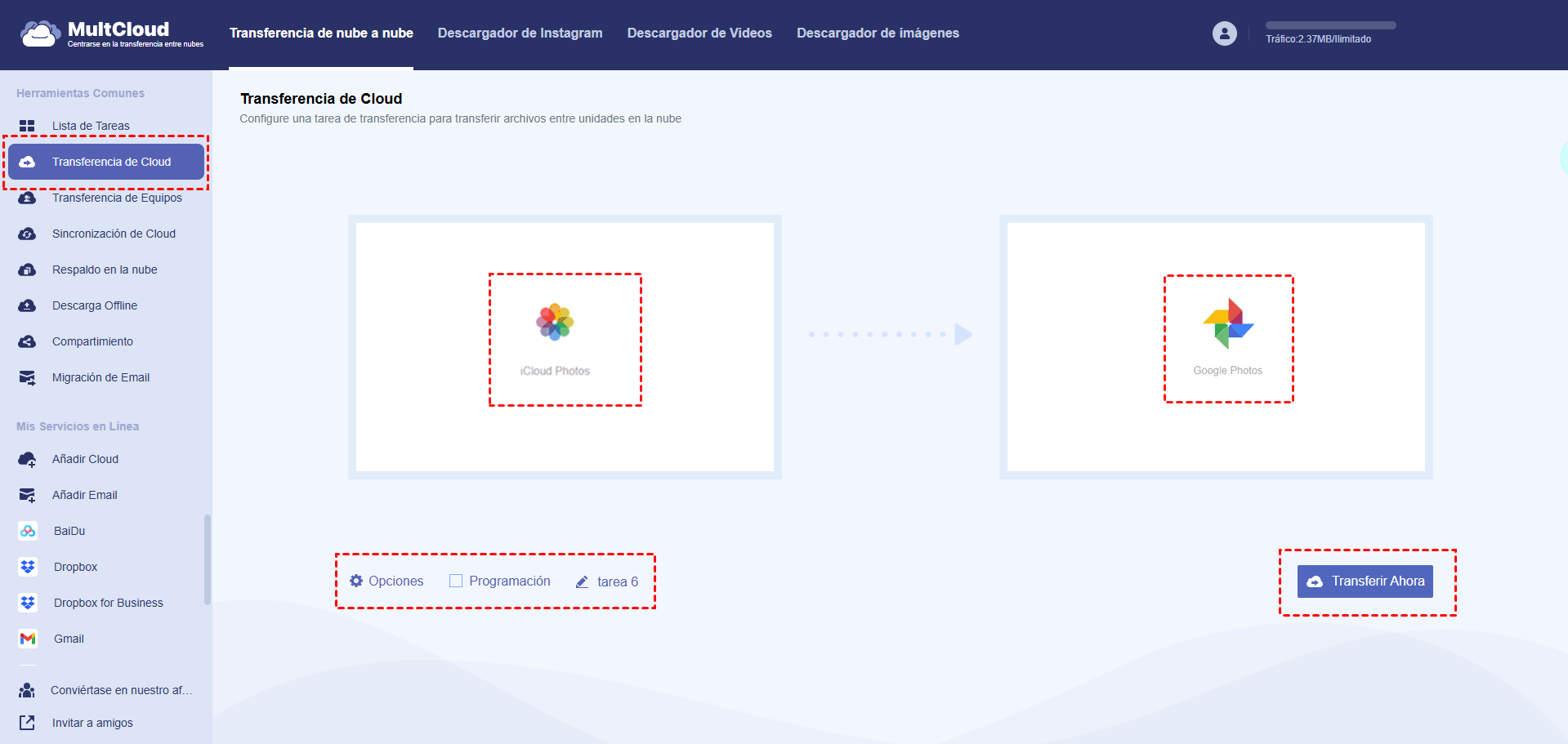 Sin embargo, si quieres transferir fotos de otras nubes a iCloud y viceversa, puedes usar MultCloud, un servicio profesional de migración de datos entre nubes, para transferir fotos de iCloud a Google Fotos u otras nubes sin tener que descargarlas y recargarlas.