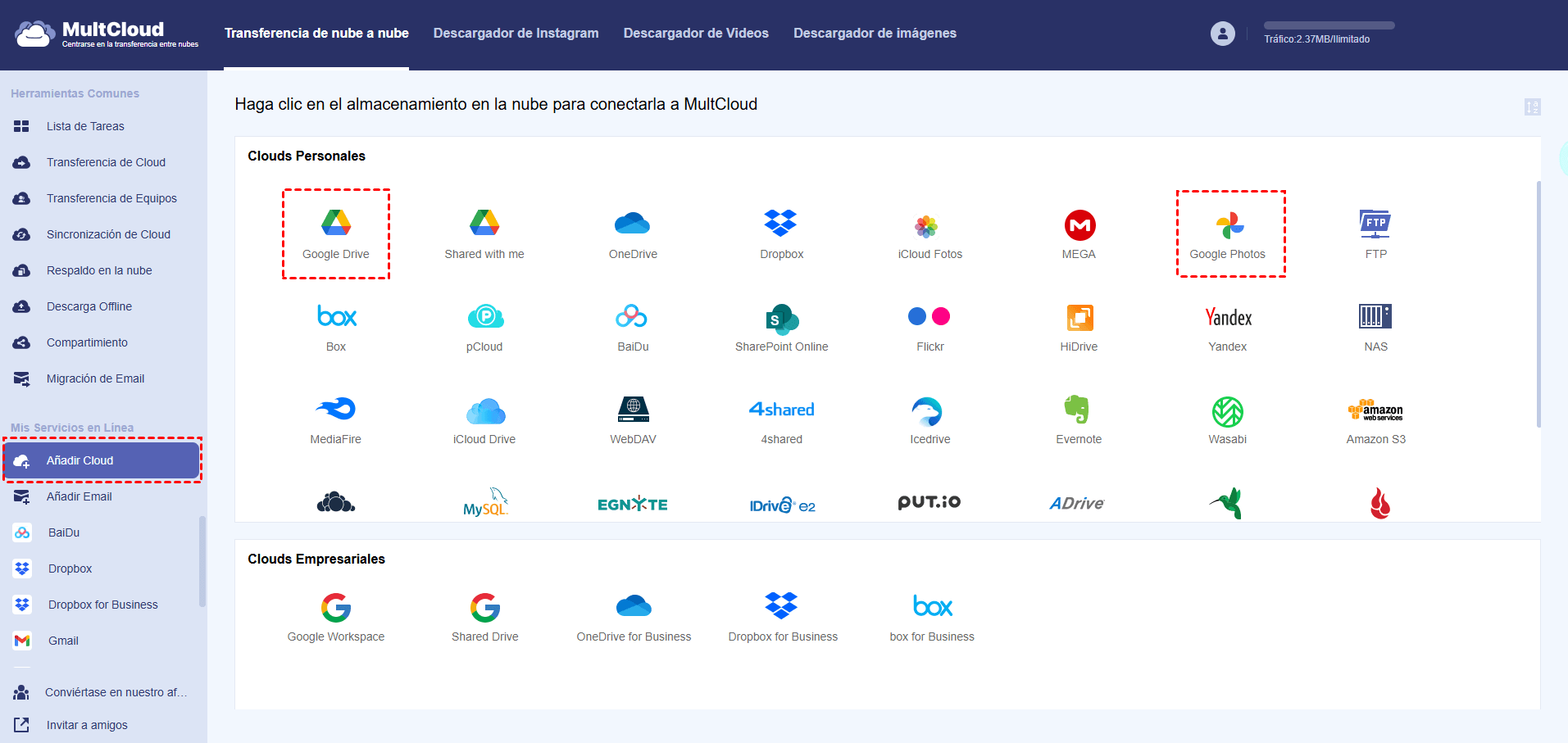 Nota: Como MultCloud no tiene límite en el número de nubes a añadir, también puede añadir otras unidades de nube a MultCloud para gestionar mejor varias cuentas de almacenamiento en nube.