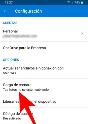 Paso 5. Toca "Carga de cámara" y elige una cuenta OneDrive para activar la función Carga de la cámara. A continuación, OneDrive cargará las fotos de tu iCloud.