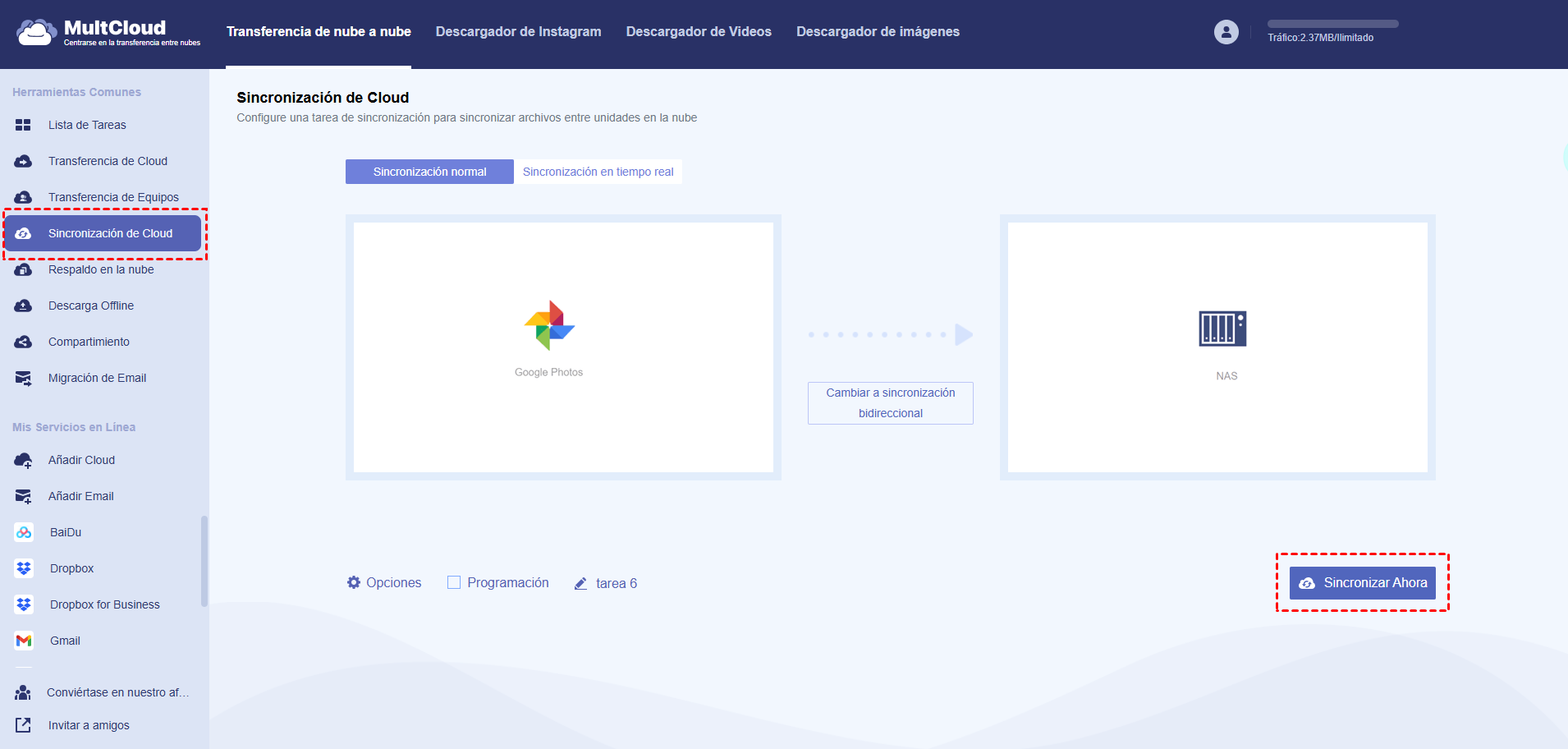 crear una tarea de sincronización y selecciona Google Fotos como origen y Synology NAS como destino. Para relizarlo, haz clic en el botón “Sincronizar Ahora".