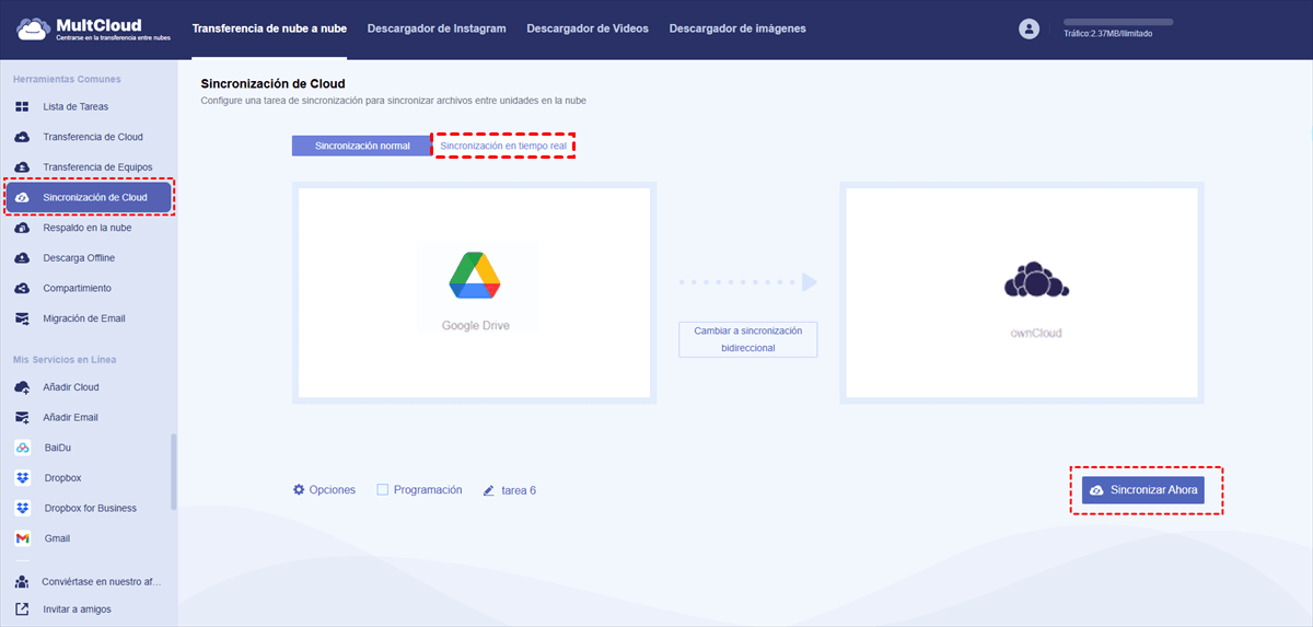 3. Pulsa Sincronización de Cloud > Sincronización en tiempo real, elige Google Drive como nube de origen y ownCloud como destino, pulsa el botón Sincronizar Ahora para sincronizar los archivos de Google Drive con ownCloud directamente.