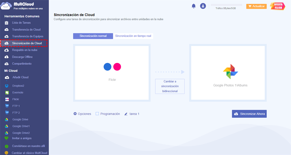 Haz clic en el icono "Sincronización de Cloud" y selecciona Flickr como directorio de origen y la carpeta "Álbum" de Google Fotos como directorio de destino. A continuación, haz clic en "Sincronizar ahora" y comenzará la sincronización de fotos entre Flickr y Google Fotos.