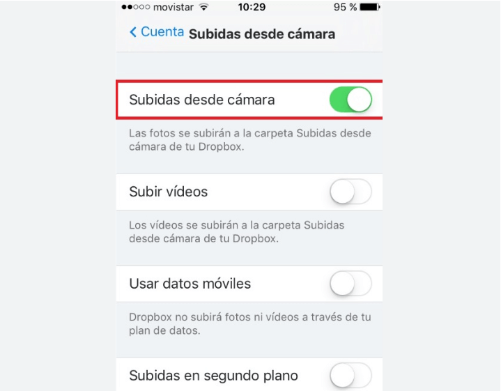 - Subidas en segundo plano: Actívalo y déjalo encendido para que se suban automáticamente todos los datos de la app Fotos a Dropbox cuando estés conectado a internet.