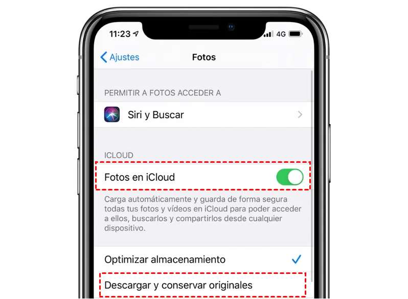 Nota: Si cree que su teléfono móvil no tiene espacio suficiente para almacenar imágenes o vídeos descargados de iCloud Fotos, puede optar por completar las operaciones de descarga y carga en su ordenador.