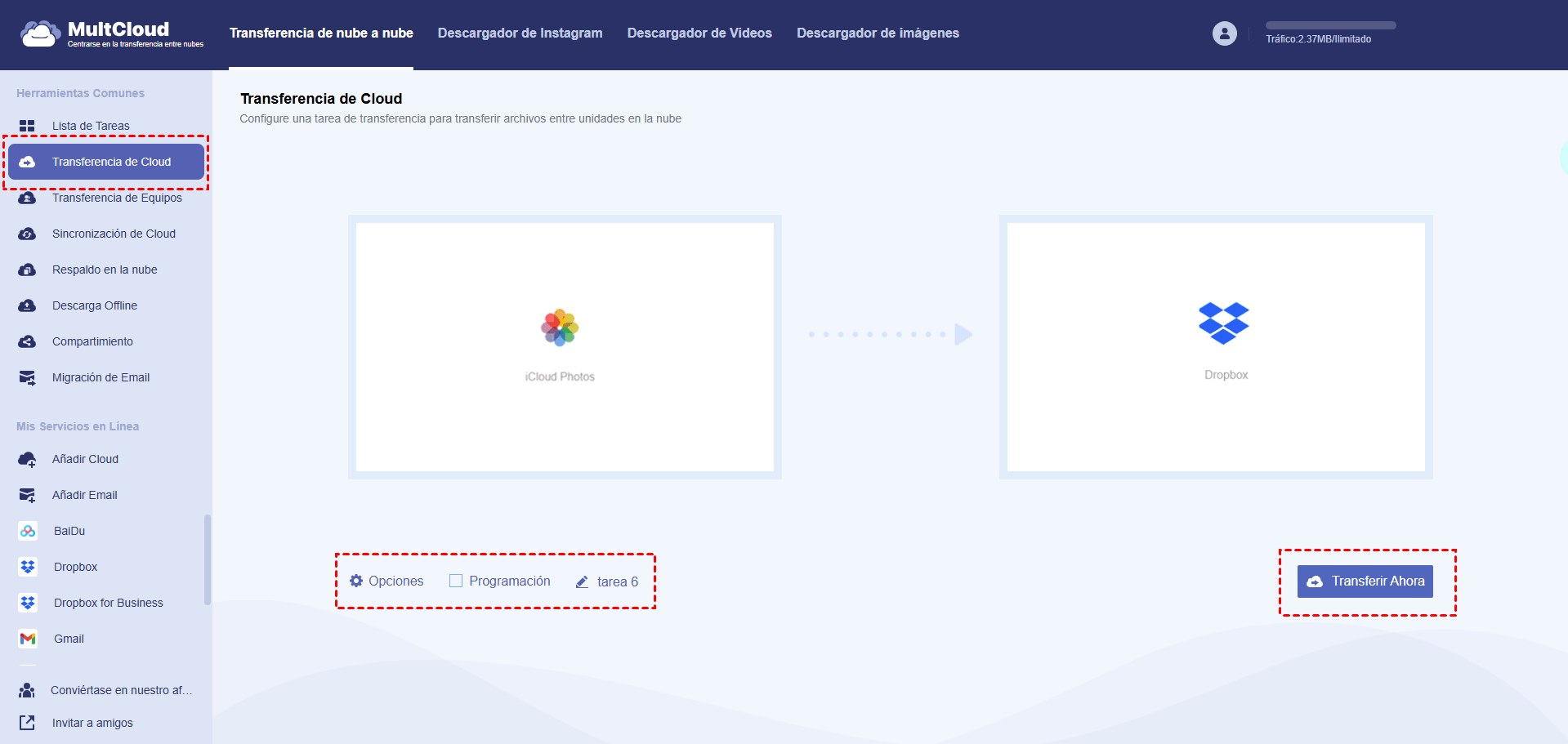 ¿Existe alguna forma rápida de pasar iCloud Fotos directamente a Dropbox? Afortunadamente, puede recurrir a una herramienta profesional de transferencia en la nube: MultCloud, que permite migrar archivos directamente entre distintos servicios o cuentas en la nube.