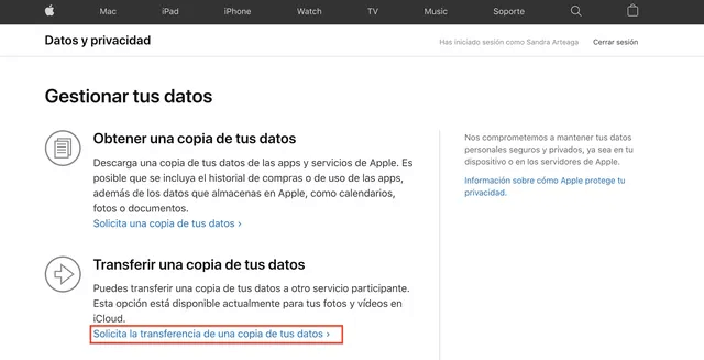 2. Pulse Solicita la transferencia de una copia de sus datos.