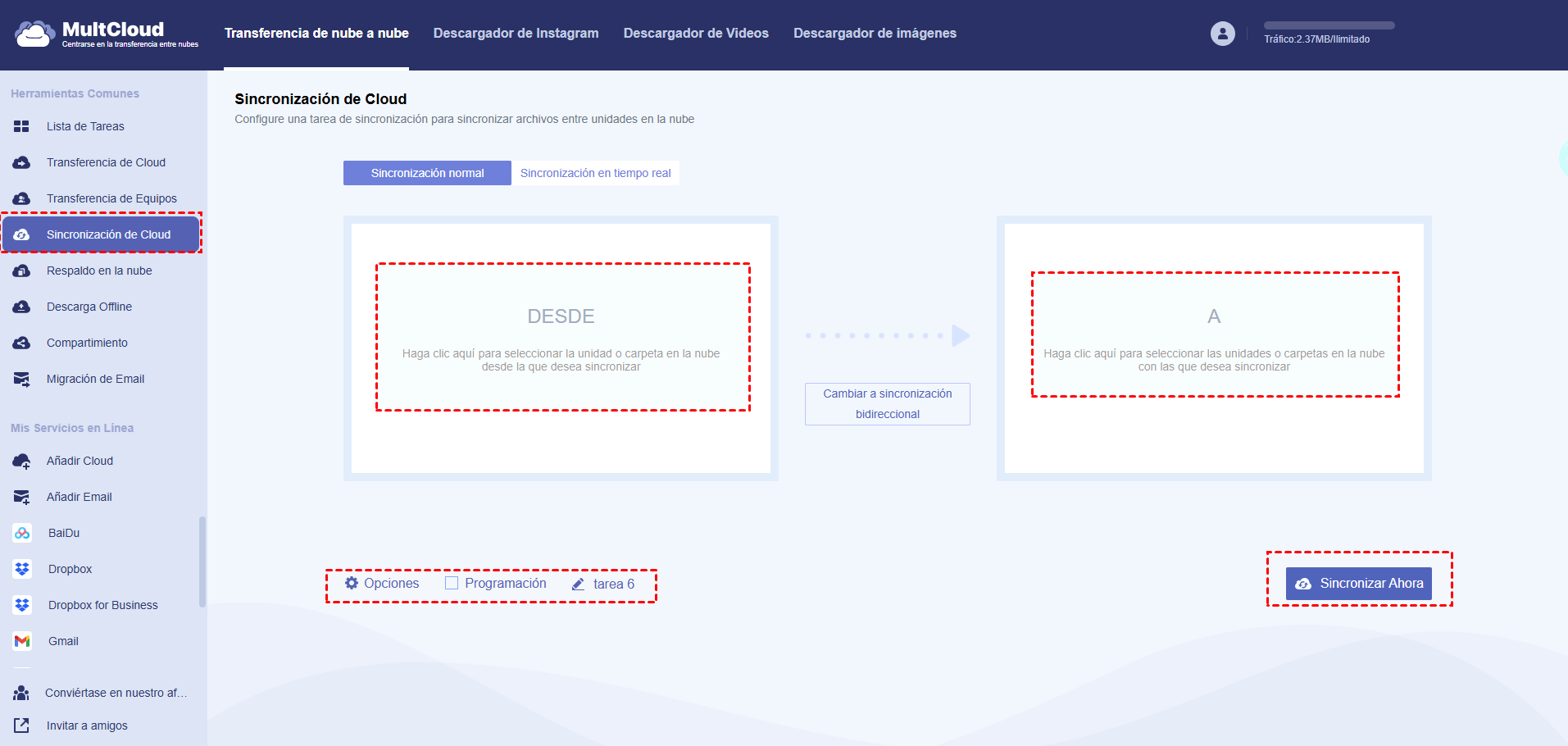 - Por defecto, es Sincronización Normal. Y puede configurar total 10 modos de sincronización en "Opciones", como Sincronización en tiempo real, Sincronización bidireccional y más. Además, puedes habilitar Notificación por Email y Filtrar para gestionar la tarea más fácilmente.