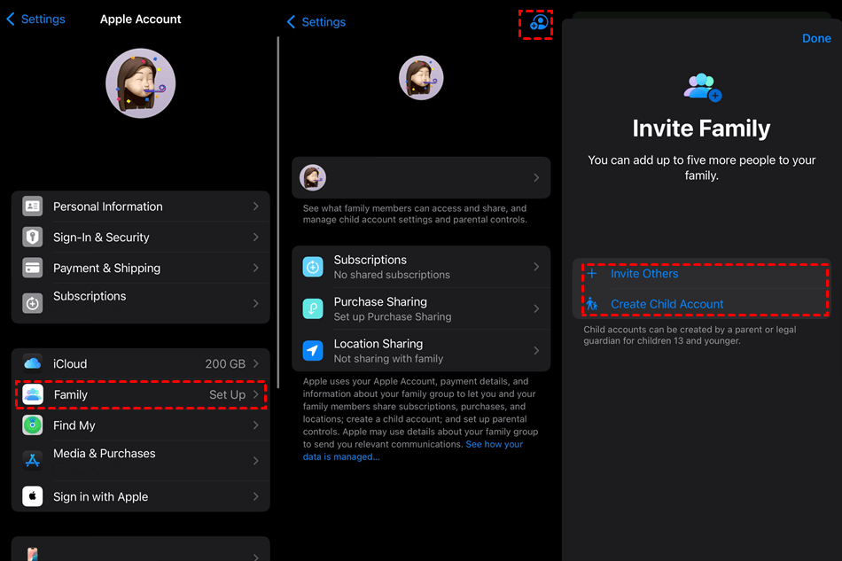 Step 2. Choose to invite other members by selecting your contacts or sending an email/message invitation. Also, you can create an Apple account for your child.