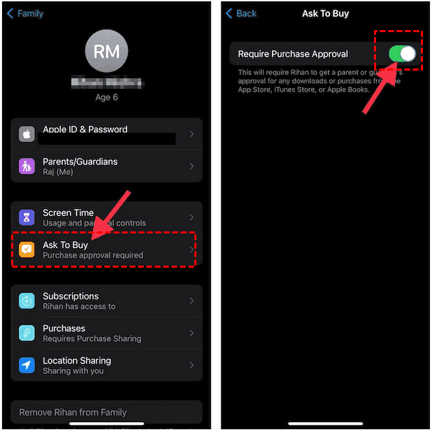 - Enable Ask to Buy if you want to approve purchases made by family members under a certain age.