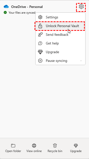 1. Configuring Personal Vault: There is a brief setup procedure that you must complete the first time you use the Personal Vault. This includes utilizing two-factor authentication to confirm your identity. Click the OneDrive icon > Help & Settings > Unlock Personal Vault. Then follow the guide to set up Personal Vault.