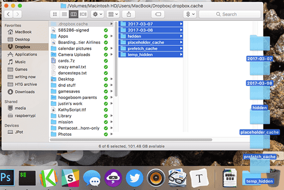 2. Like in Windows, you'll need to access the hidden ".dropbox.cache" folder. To do this, press Cmd + Shift + Period to toggle hidden files. You should now see the cache folder.