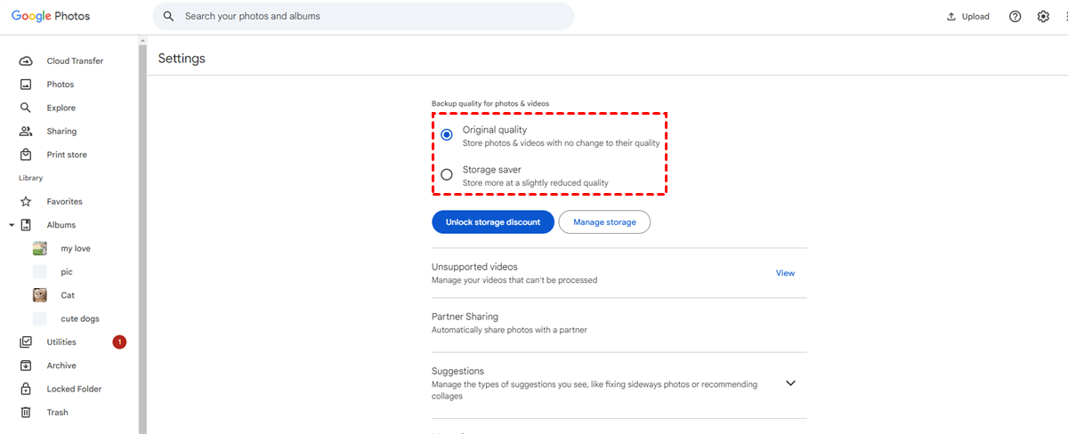 Step 2. Here, to stop compressing photos, it is recommended to choose "High quality" (which applies compression to save space).