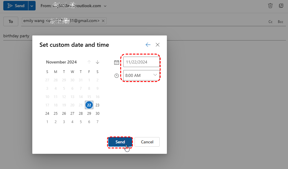 Step 3. Set a New Time: In the composing window, you can click on "Send" optio. Choose "Schedule Send", which allows you to specify a new delivery time for the email. Adjust the time to your desired delivery time using the calendar picker or by manually entering the date and time.