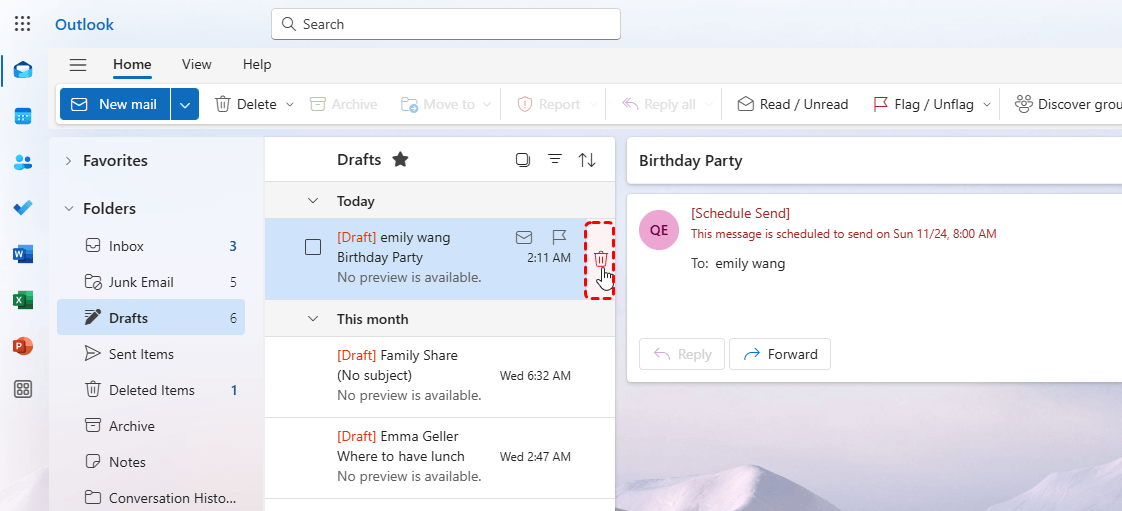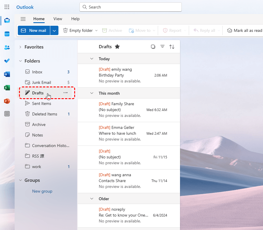 Navigate to the Drafts: Click on the "Drafts" folder in your email navigation pane. This folder contains all emails that haven't been sent yet, including scheduled ones.