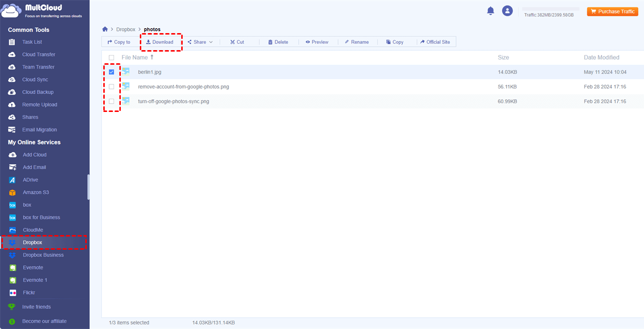 Step 5. Open Dropbox on MultCloud, select the photos you want to export, and click "Download" in the upper bar. Then, the photos will be saved to your Android phone.