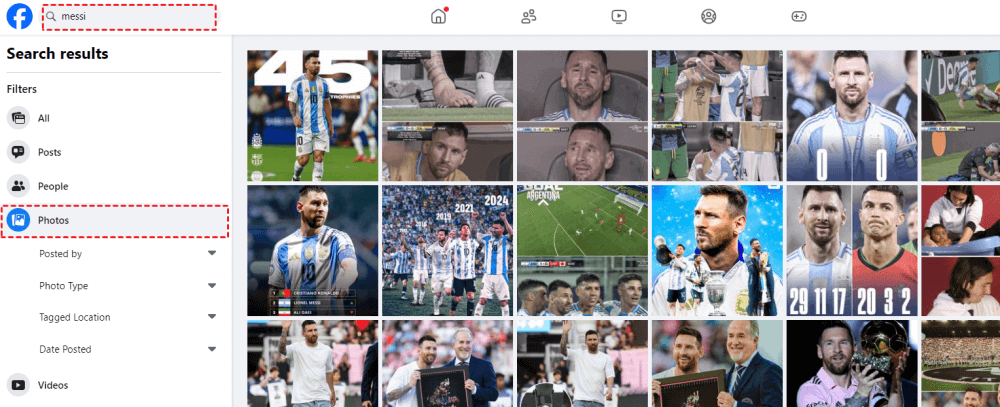 1. Input the file name of the image on Facebook top search box, and hit Enter to search.
