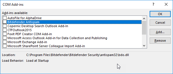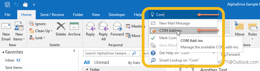 - Identify Problematic Add-ins: Temporarily disable add-ins one by one to pinpoint the culprit. You can do this by going to File > Options > Add-ins. Select COM Add-ins and click Go. Or at the top of Outlook, in the "Tell me what you want to do" search box, type "Com". The list will populate and then you should click on "COM Add-ins".