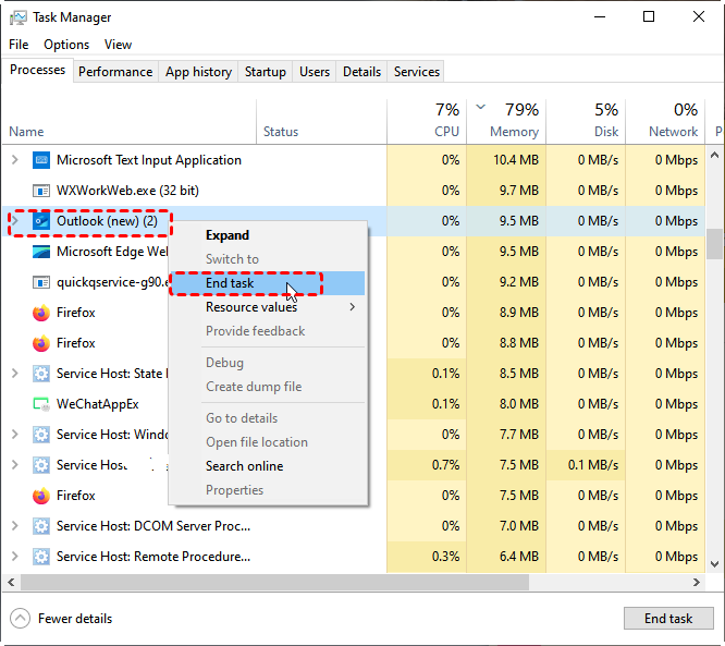 Step 3. End the Task: Right-click on the "Outlook" process and select "End Task."