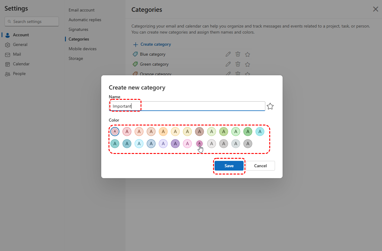 Step 3. In the pop-out mini window, name the category as you need, here we use "Important". And choose a color for the tag.