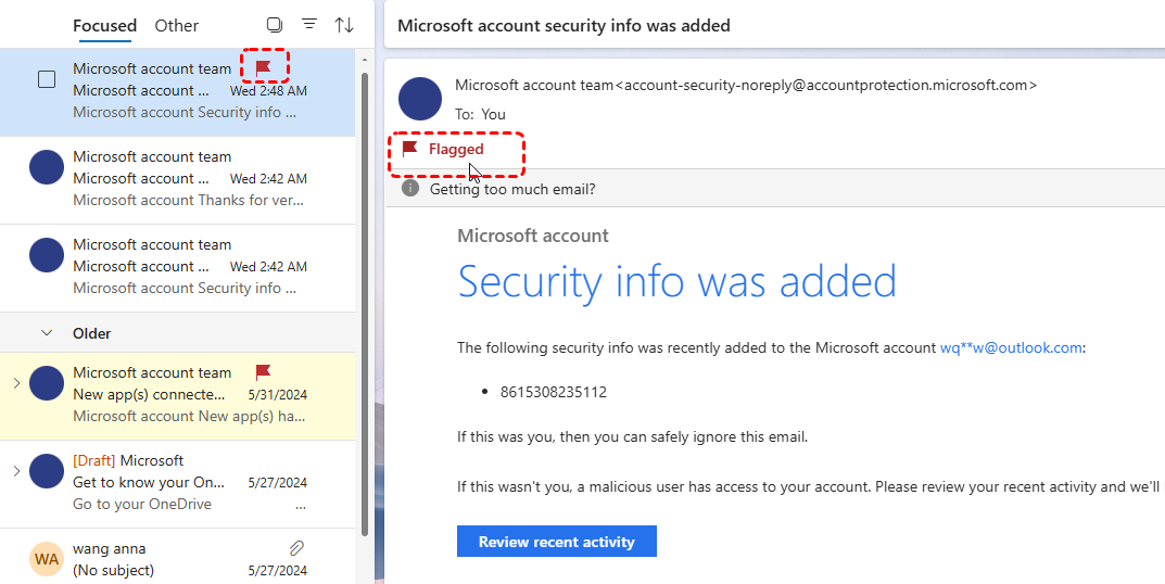 Step 3. Once the flag is highlighted, the email is marked as important with a red flag icon.