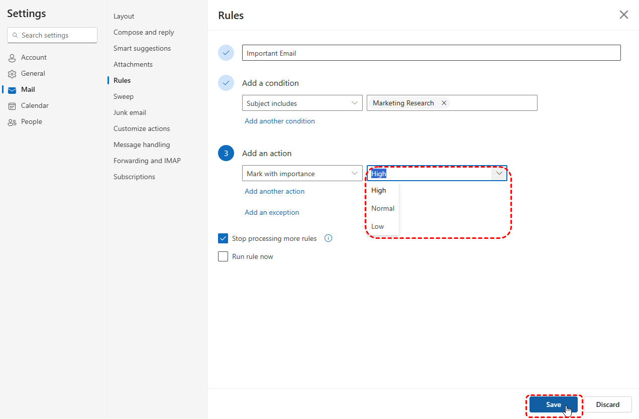 Step 5. Then you can choose importance level from "High", "Normal" and "Low". Once done, click "Save."