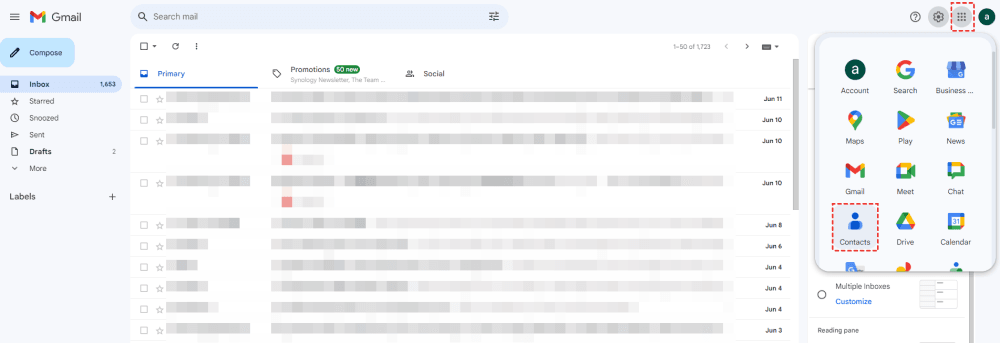 1. Log in to your Gmail, and tap the Google apps icon next to Settings on the top right, then choose Contacts. Here you can find all your Google contacts.