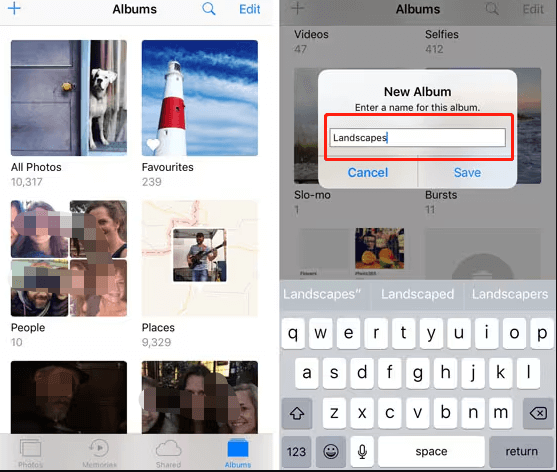- Tap the "+" icon and click on "New Album" from the pop-up menu. Follow the onscreen instruction to create a name for the new album and save the changes.