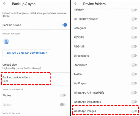 Step 3: Under Back up device folders, turn on WhatsApp images option.