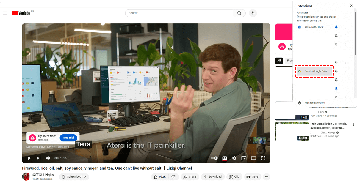 Step 3. Click on the Extension Icon: When you're on the YouTube video page, click on the "Save to Google Drive" extension icon in the Chrome toolbar.