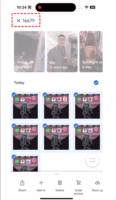 3. Scroll down to the end of your photos, then select the images using your fingers, then back to the top to select all of them, it shows the count number on the top left, the number is your number of photos and videos in Google Photos.
