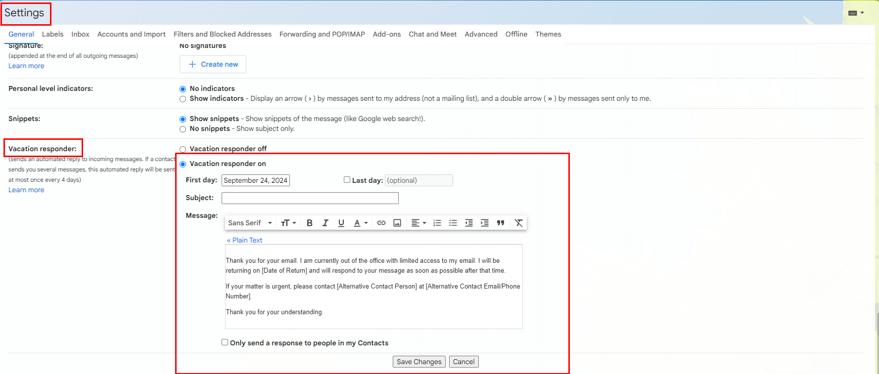 Step 7. Save changes: Click "Save Changes" to activate your vacation responder.