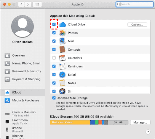 - Click "Options" next to iCloud Drive and ensure all necessary apps are checked to use iCloud Drive.