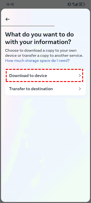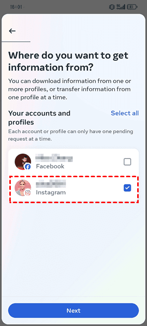 4. Configure and Choose Data to Download: Hit Download or Transfer information > choose your Instagram account > Tick All available information > Download to device.