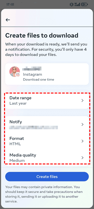 8. Choose the data range, format, and media quality from the created files, and hit Create files to download your Instagram data.