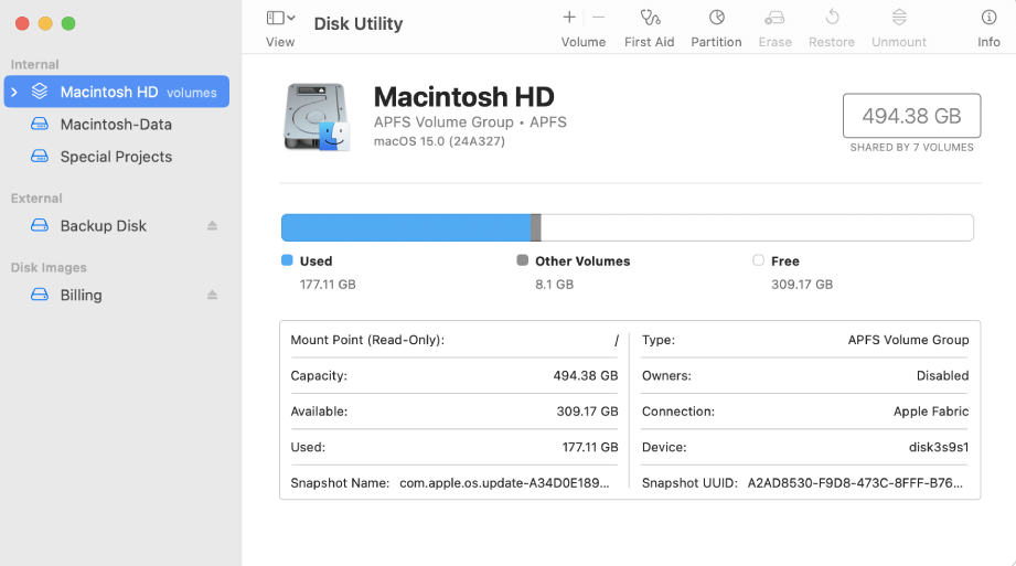 4. Click "First Aid" and follow the on-screen prompts to run a disk repair.