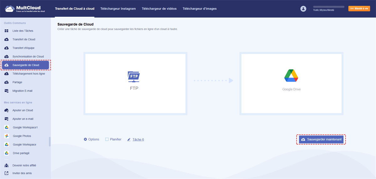 Oui, la fonctionnalité « Sauvegarde de Cloud » de MultCloud vous permet de sauvegarder progressivement vos données importantes depuis votre FTP vers Google Drive. Après avoir ajouté vos comptes FTP et Google Drive, accédez à la page « Sauvegarde de Cloud », spécifiez la source et la destination, puis cliquez sur « Sauvegarder maintenant » pour lancer la sauvegarde depuis votre FTP vers Google Drive. Si vous devez restaurer des données, vous pouvez trouver la tâche correspondante dans la « Liste des Tâches » et restaurer la version précédente si nécessaire.