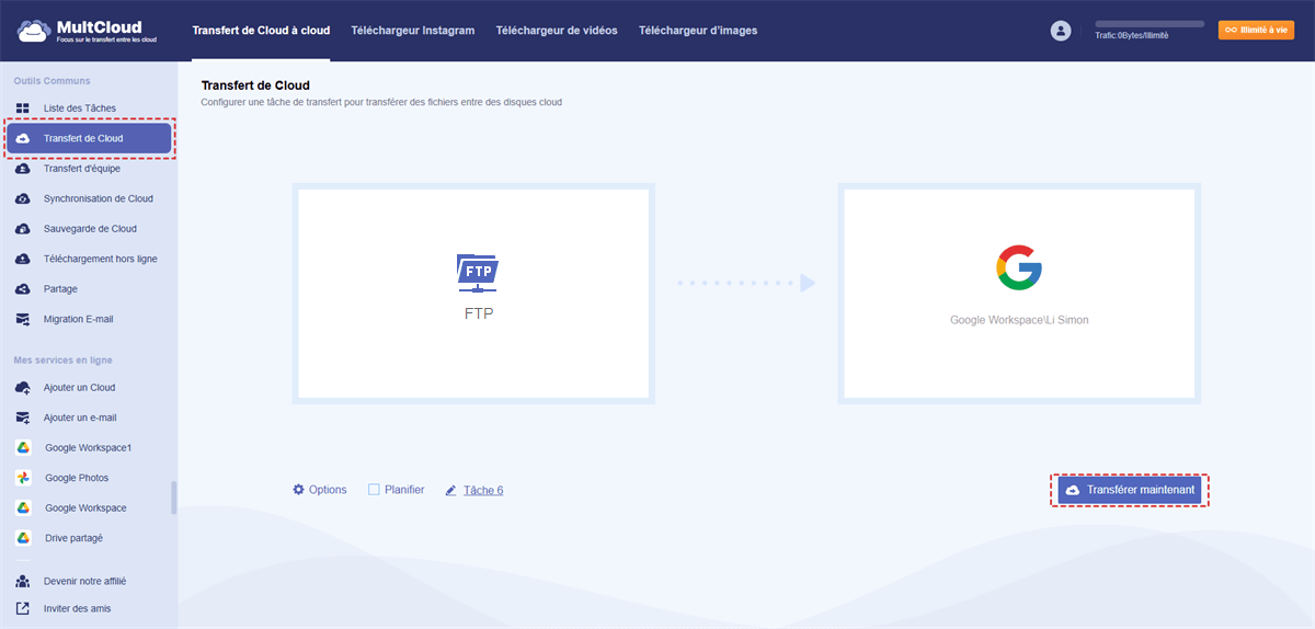 Cliquez sur « Transfert de Cloud », sélectionnez FTP ou ses sous-répertoires comme source, Google Drive ou son chemin de destination comme cible, puis cliquez sur « Transférer maintenant ». Le processus démarrera sur la page « Liste des Tâches »