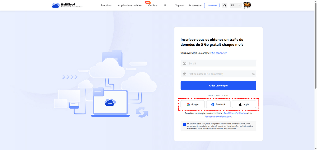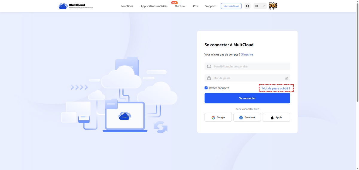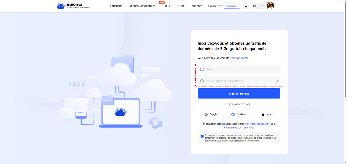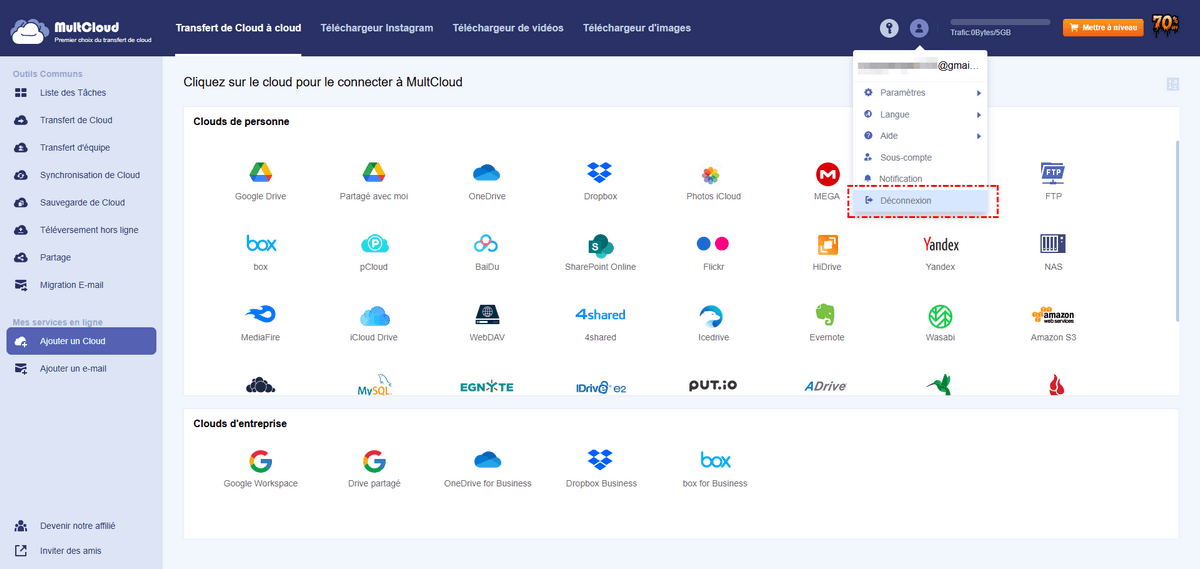 Pour transférer des fichiers entre vos espaces de stockage cloud, vous devez d'abord créer un compte MultCloud et y ajouter vos espaces de stockage. Consultez les instructions ci-dessous pour savoir comment créer et gérer votre compte MultCloud.