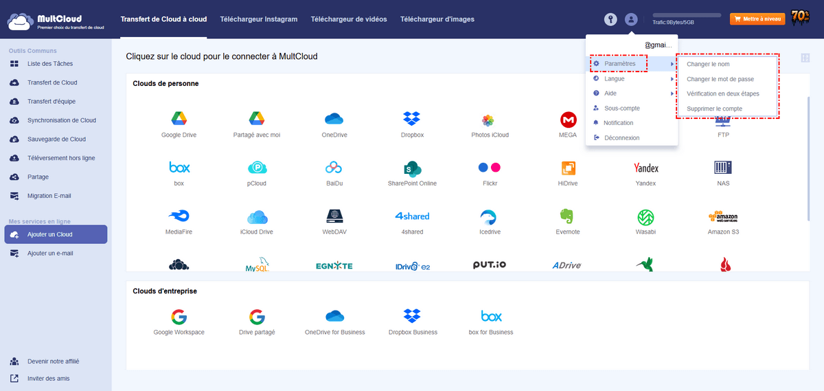 Lorsque vous possédez un compte MultCloud, vous pouvez gérer votre compte dans les Paramètres du compte.
