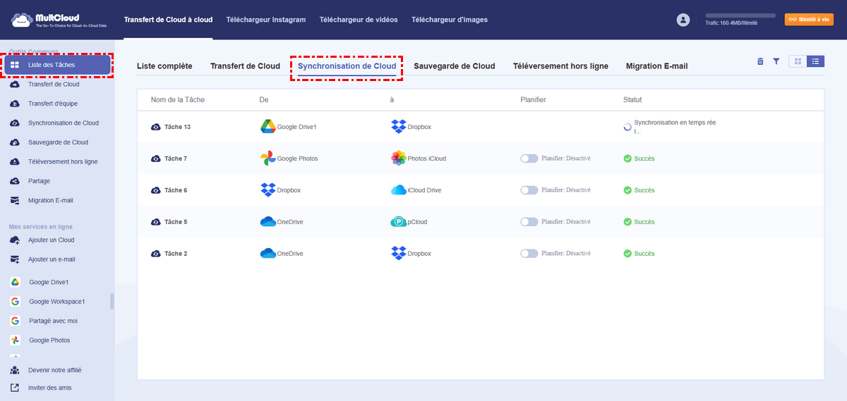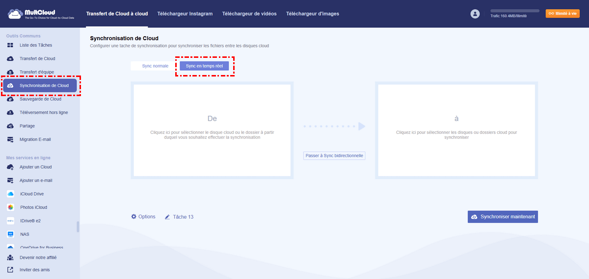 La fonction de synchronisation en temps réel vous permet de synchroniser vos données en continu grâce à la cloud synchronisation automatique. Elle surveille le répertoire source à synchroniser en temps réel et, si des fichiers ou des dossiers sont modifiés, MultCloud les synchronise immédiatement avec le répertoire cible.