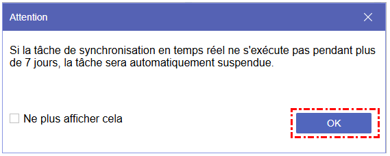 Après avoir cliqué sur le bouton « Synchroniser maintenant », une fenêtre s'affichera pour vous avertir que si la synchronisation en temps réel reste inactive pendant plus de 7 jours, elle sera automatiquement interrompue. Cliquez sur « OK » pour lancer la synchronisation.
