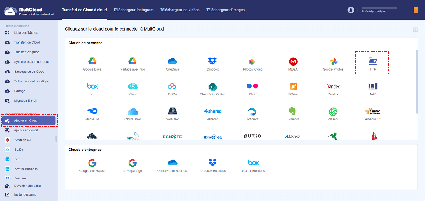 Pour accéder à compte Dropbox via FTP, il est fortement recommandé d’utiliser MultCloud. Il s’agit d’une application de ligne gratuite qui prend en charge la connexion de nombreux services en ligne pour la sauvegarde, la synchronisation et le déplacement de fichiers entre eux.
