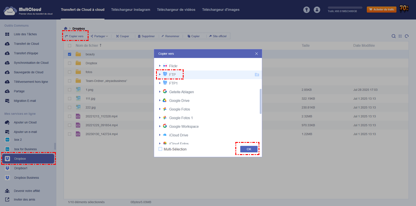 Sélectionnez des fichiers spécifiques à partir de Dropbox/FTP et de les déplacer vers un autre Cloud par « Copier » ou « Copier vers ».