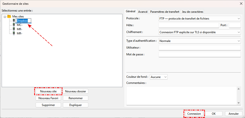 Ouvrez FileZilla, allez dans « Fichier » > « Gestionnaire de sites » > « Nouveau site », puis cliquez sur « Dropbox » pour saisir vos identifiants FTP Dropbox. Une fois les paramètres définis, cliquez sur « Connexion ».